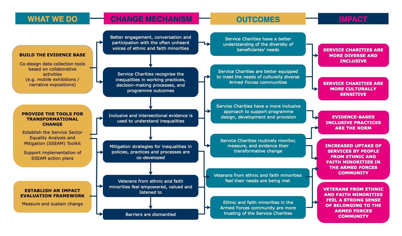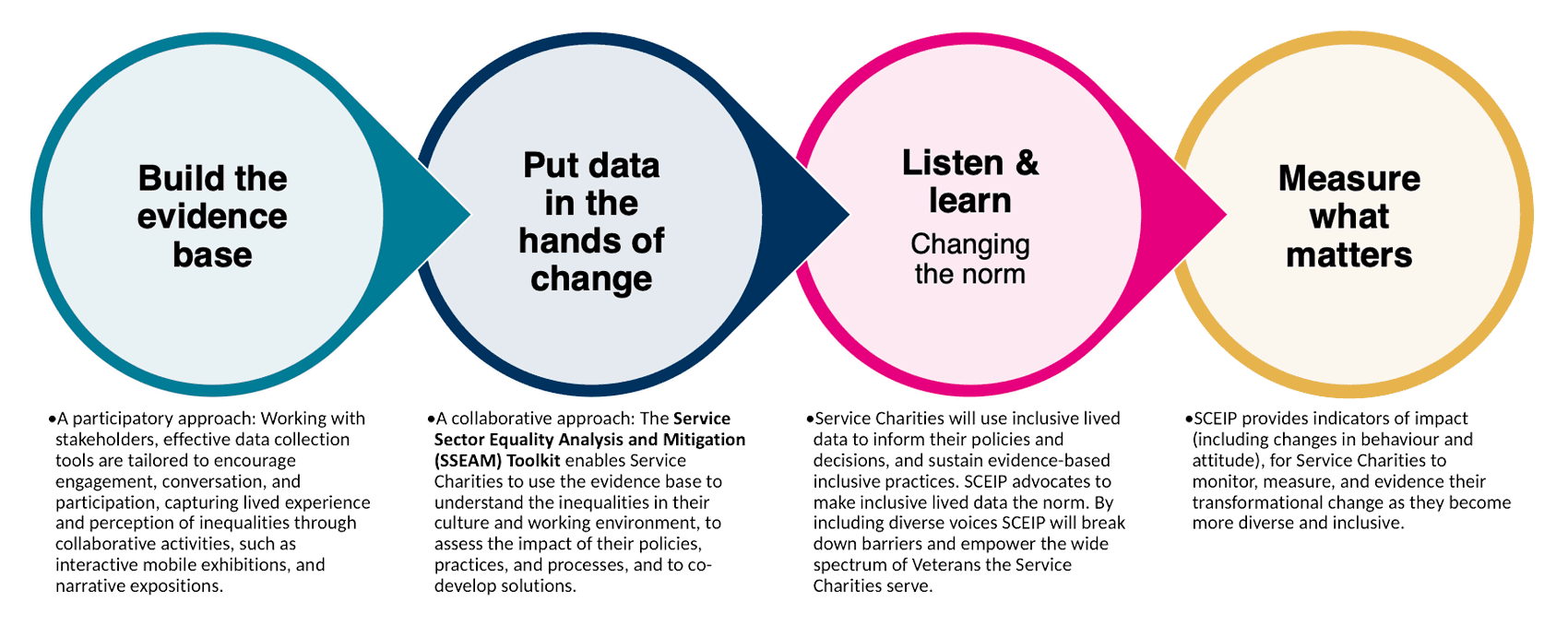 SCEIP provides innovative tools to enable Service Charities to recognise the inequalities in their working practices, and their decision-making processes, and empowers them to become more diverse and inclusive and better equipped to meet the needs of a culturally diverse Armed Forces community. SCEIP enables Service Charities to use lived experience data to drive transformational change in four steps (Fig.1). SCEIP’s Theory of Change (Fig.2) illustrates how we anticipate our activities will lead to impact across the Services sector.